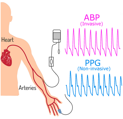 Według danych Głównego Urzędu Statystycznego z roku 2021 przyczyną ponad 1/3 zgonów w Polsce są choroby układu krążenia. Kluczowy w diagnostyce dolegliwości układu sercowo-naczyniowego jest ciągły pomiar ciśnienia tętniczego (ABP, z ang. arterial blood pressure). Najdokładniejszy sygnał ABP uzyskujemy poprzez pomiar inwazyjny, co wiąże się z dyskomfortem pacjenta i ryzykiem powikłań. Alternatywą są metody nieinwazyjne, których wadą jest jednak brak pomiaru ciągłego (w przypadku sfigmomanometru) lub wysoka cena urządzeń umożliwiających pomiar ciągły ABP. Rozwiązaniem może okazać się użycie czujnika fotopletyzmograficznego (PPG, z ang. photoplethysmography), który jest relatywnie tani i mierzy zmiany objętości krwi w naczyniu krwionośnym w sposób nieinwazyjny i ciągły.