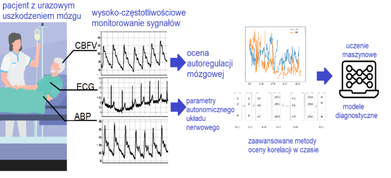 Aby wyjść naprzeciw tego zagadnienia proponujemy projekt o nazwie AUTOMATIC – Analiza relacji między autonomicznym układem nerwowym a autoregulacją mózgową z wykorzystaniem uczenia maszynowego. Główna hipoteza projektu zakłada, że dynamika czasowego związku między autoregulacją mózgową a autonomicznym układem nerwowym jest kluczowa i wymaga zbadania przy użyciu bardziej wyrafinowanych podejść do analizy danych, wykorzystujących informacje zawarte w fluktuacjach tego związku. Tego rodzaju metody są dobrze ugruntowane w ekonometrii do śledzenia zmian indeksów giełdowych i kursów walutowych, ale można je z powodzeniem dostosować do zastosowań biomedycznych. Planujemy wykorzystać te metody do scharakteryzowania czasowego profilu związku autoregulacji mózgowej z autonomicznym układem nerwowym na podstawie danych i sygnałów (prędkości przepływu krwi (CBFV), elektrokardiogramu (ECG), ciśnienia tętniczego (ABP)) zarejesrtowanych podczas nieinwazyjnych pomiarów hemodynamicznych u zdrowych ochotników. Istnieje wiele wskaźników pozwalających scharakteryzować autoregulację mózgową i autonomiczny układ nerwowy wraz ze standardowymi miarami i skalami używanymi do opisu stanu pacjentów z patologiami wewnątrzczaszkowymi. Ponieważ związku autoregulacji mózgowej i autonomicznego układu nerwowego nie można interpretować w oderwaniu od pozostałych sygnałów biomedycznych i oceny stanu pacjenta, planujemy zastosować podejście oparte na uczeniu maszynowym do wyboru cech.